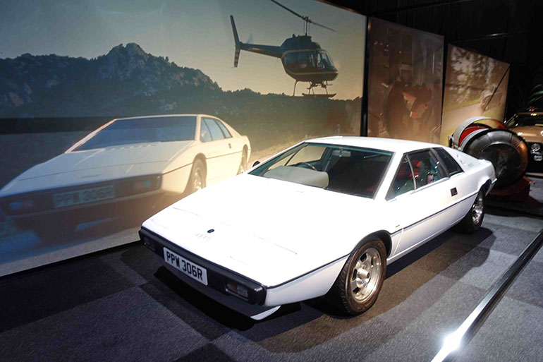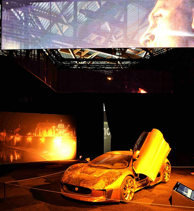 Δεν είναι μόνο η Aston Martin DB5 από το «Goldfinger» αλλά και η επιβλητική Rolls-Royce Phantom III από την ίδια ταινία. Δεν είναι μόνο το όχημα της πράκτορα Nomi από το «No Time To Die», η Superleggera DBS, αλλά και τα ημικατεστραμένα Land Rover από το κυνηγητό στο βρετανικό δάσος, δεν είναι μόνο το Q Boat από το «The World Is Not Enough» αλλά και ένα ολόκληρο σύστημα ανατροπής για την Aston Martin του 007 στον πάγο, όπως συνέβη στη σκηνή της μάχης με μια φορτωμένη με πυραύλους Jaguar ενός αντιπάλου. Το ταπεινό Renault 11 TXE από το μακρινό 1985 και το «A View To A Kill», λίγο πιο κάτω, εκτίθεται δίπλα στη Lotus Esprit S1 από το James Bond «The Spy Who Loved Me» του 1977, ενώ στο φινάλε της εκθεσιακής διαδρομής και πριν από το θεματικό μπαρ-εστιατόριο που έχει στηθεί στο τέλος των χώρων της έκθεσης, μια καμένη από το φλογοβόλο του Daniel Craig dark orange Jaguar C-X75 από τη σκηνή του κυνηγητού με τον Mr. Hinx στους νυχτερινούς δρόμους της Ρώμης στέκεται όπως ένα καρέ από το φιλμ.