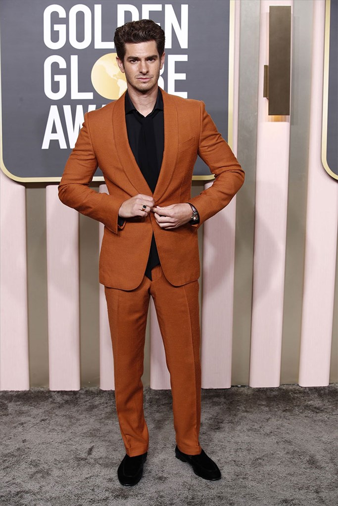 Ο Άντριου Γκάρφιλντ αποφάσισε να ξεφύγει από το κλασικό μαύρο σμόκιν για το κόκκινο χαλί και προτίμησε πορτοκαλί κοστούμι, το οποίο συνδύασε με μαύρο πουκάμισο.