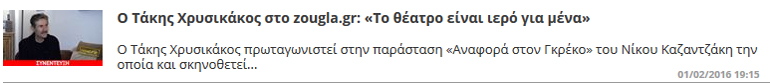 O Κωνσταντίνος Κωνσταντόπουλος μίλησε στο Zougla.gr για την παράσταση «Πλάτωνος Απολογία Σωκράτους» και τόνισε τις ιδιαιτερότητες του έργου και του ρόλου που υποδύεται. Ο γνωστός ηθοποιός αποκάλυψε τι τον συγκινεί στον ρόλο του και ποιά είναι τα μελλοντικά του σχέδια.