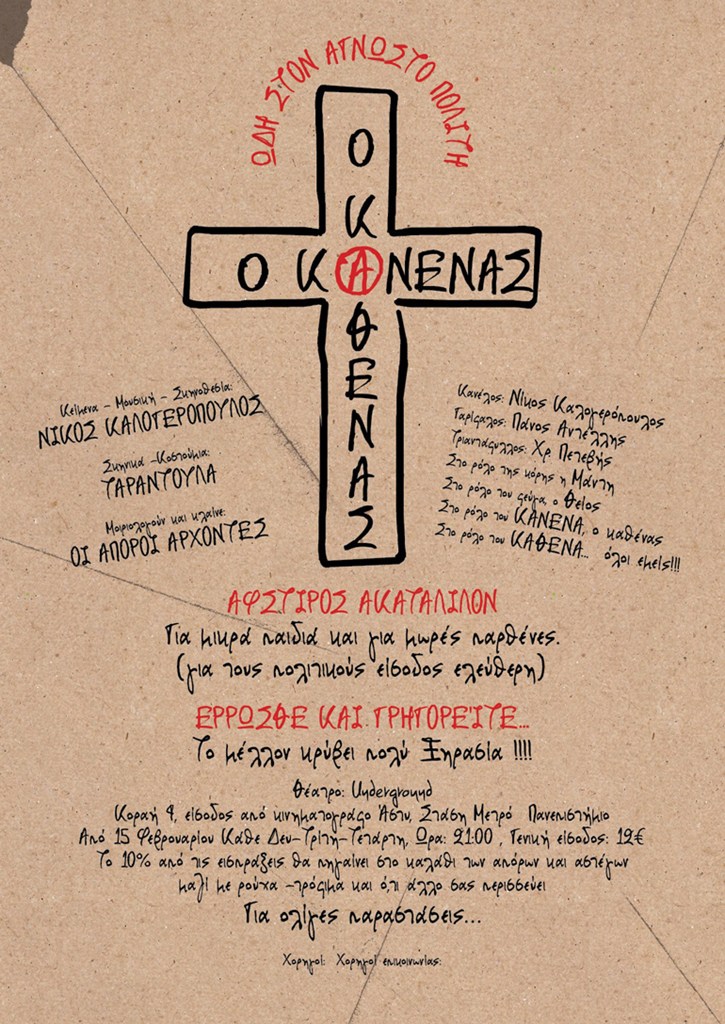 Ο Νίκος Καλογερόπουλος πρωταγωνιστεί στην παράσταση «Ο Κανένας ο Καθένας» που ανεβαίνει στο θέατρο «Underground» στις 15 Φεβρουαρίου.