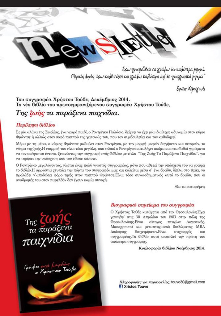 Ο Χρήστος Τούβε είναι ένας νέος ταλαντούχος συγγραφέας από τη Θεσσαλονίκη. Ολομόναχος, χωρίς τη βοήθεια εκδοτικών οίκων, προώθησε τo βιβλίο του «Της ζωής τα παράξενα παιχνίδια», το οποίο σήμερα οδεύει από τη δεύτερη προς την τρίτη έκδοση και σε μερικές μέρες θα κυκλοφορεί σε 63 χώρες του εξωτερικού.