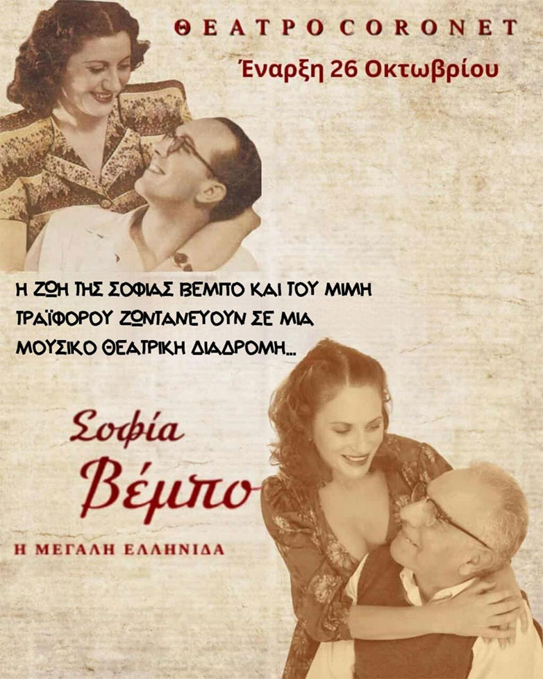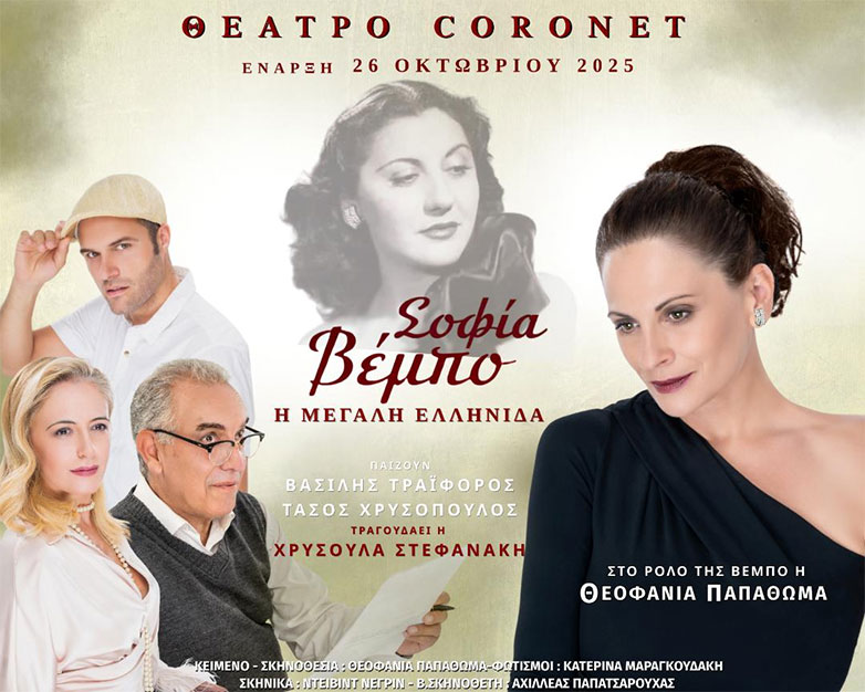Μια μουσικοθεατρική παράσταση που αναβιώνει τη ζωή της Σοφίας Βέμπο και τα τραγούδια της με τη Θεοφανία Παπαθωμά να υποδύεται αυτή τη μεγάλη Ελληνίδα, τη γυναίκα σύμβολο, που ύψωσε το ανάστημά της απέναντι στον κατακτητή και η φωνή της έγινε η κραυγή της Λευτεριάς, έρχεται από τις 26 Οκτωβρίου στο Θέατρο Coronet.