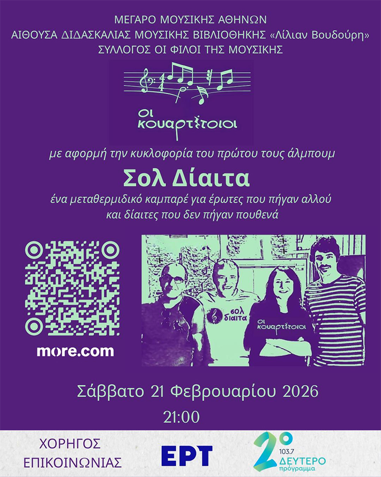 Με αφορμή την κυκλοφορία τού πρώτου τους άλμπουμ με τίτλο «Σολ Δίαιτα», οι Κουαρτέτοιοι παρουσιάζουν την ομώνυμη μουσική παράσταση στη Μουσική Βιβλιοθήκη του Μεγάρου Μουσικής Αθηνών.
