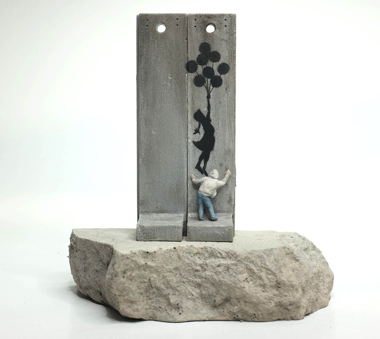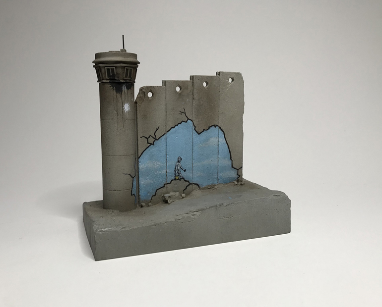 Πριν ένα χρόνο, ο Banksy είχε πρωτοστατήσει στο άνοιγμα ενός ξενοδοχείου στη Βηθλεέμ, απέναντι στο Τείχος που χωρίζει το Ισραήλ από την Παλαιστίνη. Τώρα, το «The Walled Off Hotel» παρουσίασε μια σειρά από σουβενίρ που διατίθενται στο κατάστημα του ξενοδοχείου. Κάθε ένα είναι ζωγραφισμένο στο χέρι από ντόπιους καλλιτέχνες και όλα αναπαριστούν το Τείχος σε κατάσταση κατάρρευσης. Σε πολλά από αυτά, μια φιγούρα με hoodie εμφανίζεται δίπλα στο Τείχος και είτε ζωγραφίζει ένα γκράφιτι είτε ανοίγει τρύπα σε αυτό με μια αξίνα.