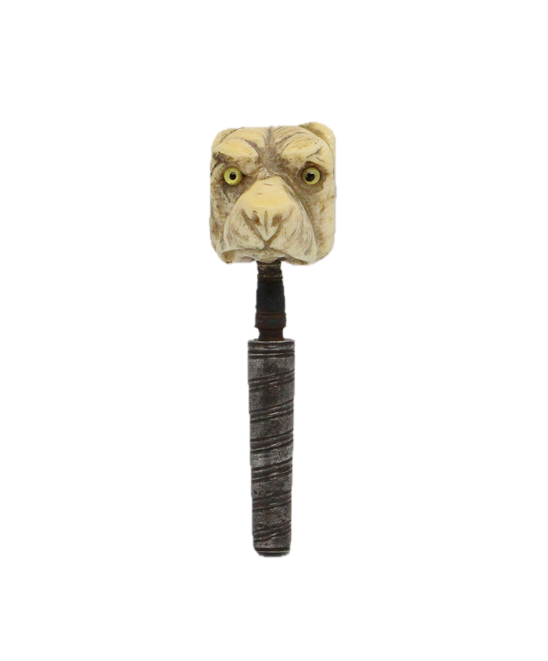 Το εικονιστικό αυτό ανοιχτήρι τσέπης (Γαλλία, π. 1780), σύμφωνα με στοιχεία που διέθεσε στο ΑΠΕ-ΜΠΕ η μουσειολόγος – υπεύθυνη οινοτουρισμού του Κτήματος, Μαγδαληνή Λειβαδιώτη, φέρει λαβή-κιβωτίδιο για την αποθήκευση καπνού, φτιαγμένη από σκαλιστό ελεφαντοστό. Η λαβή έχει τη μορφή σκύλου, με δυο ξεχωριστά γυάλινα μάτια. Το πίσω τμήμα της λειτουργεί ως καπάκι, το οποίο εξωτερικά έχει την όψη όστρακου και εσωτερικά διαθέτει έμβολο φελλού για το ασφαλές κλείσιμο. Ο κοχλίας είναι πρώιμος ελικοειδής και η θήκη του διακοσμημένη με διαγώνιες αυλακώσεις.
