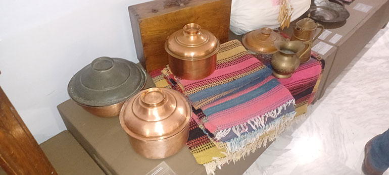 Παλιές ζυγαριές εμπόρων με τα ζύγια τους, τεντζερέδια που χρησιμοποιούσαν οι νοικοκυρές για την παρασκευή φαγητού, δοχεία, τρίφτες, μεταλλικές κούπες, ταξιδιωτικές τσάντες, υφαντά, κουρελούδες (κουβέρτες), κοσμήματα, καθρέφτες, είδη οικιακής χρήσης και διακόσμησης, αγαλματίδια, φωτογραφίες, παραδοσιακές στολές, μπουφέδες, βιβλία, είναι μερικά από τα ξεχωριστά αντικείμενα της έκθεσης, που ανήκουν σε ιδιωτικές συλλογές σε σωματεία και φορείς.