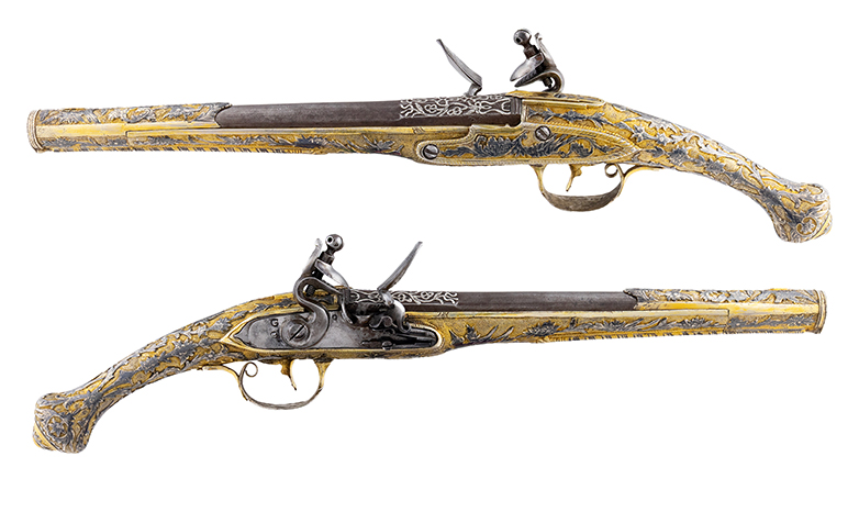 Ζευγάρι ασημένιες επίχρυσες πιστόλες που χρονολογείται στο α΄ μισό του 19ου αιώνα (Ήπειρος). Με μήκος σχεδόν μισό μέτρο, είναι περίτεχνα διακοσμημένες με φυτικές γιρλάντες με τρόπαια, ανθοφόρα αγγεία και οικιστικά σύνολα. Στις κάνες υπάρχουν ένθετα ασημένια άνθινα μοτίβα και γεωμετρικά σχήματα.