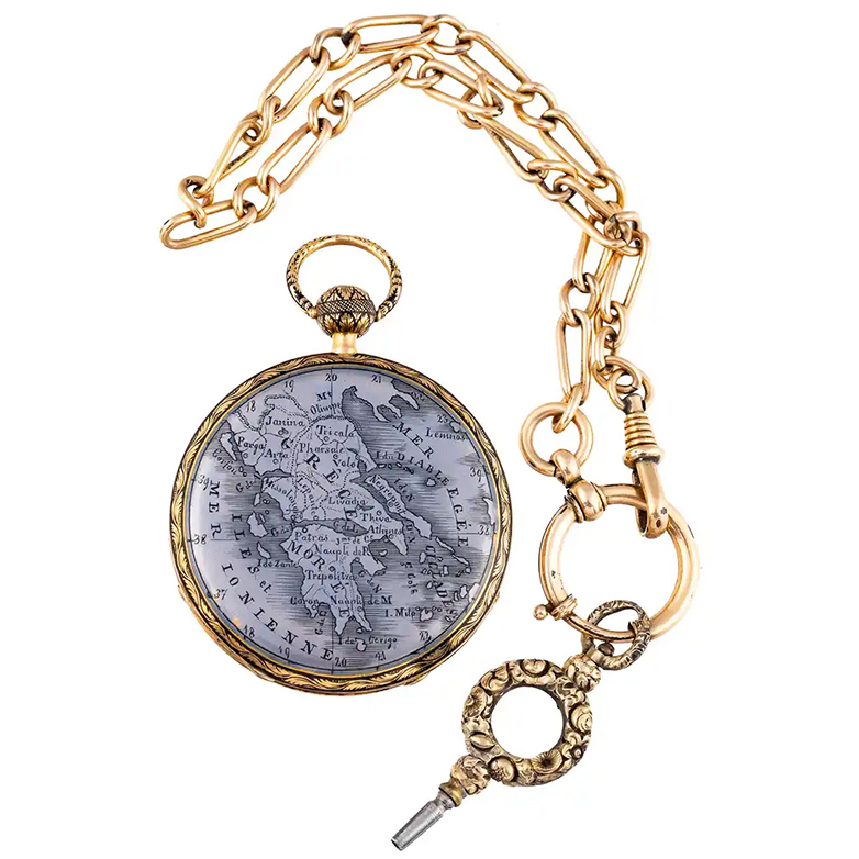 Vergos Auctions: Χρυσό ρολόι τσέπης του φημισμένου ελβετικού οίκου ωρολογοποιίας Courvoisier με χάρτη της Ελλάδας του 1826-1830