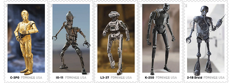 H United States Postal Service (USPS) ανακοίνωσε μια σειρά γραμματοσήμων στα οποία απεικονίζονται τα αγαπημένα droids του «Πολέμου των Άστρων». Αντιπροσωπεύοντας πάνω από τέσσερις δεκαετίες καινοτομίας και αφήγησης ιστοριών, τα droids που φιγουράρουν σε αυτή τη σειρά είναι τα IG-11, R2-D2, K-2SO, D-O, L3-37, BB-8, C-3PO, ένα GNK (ή, gonk – droid ισχύος), ένα 2-1Β (χειρουργικό droid) και το C1-10P (πιο γνωστό ως “chopper”). Το φόντο της κάθε απεικόνισης αναφέρεται στο σκηνικό αντίστοιχης αξέχαστης περιπέτειας.