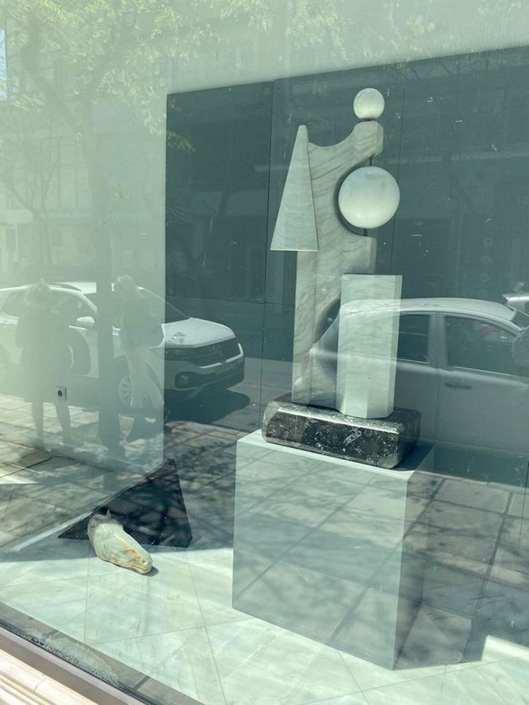 Δείγματα δουλειάς του καλλιτέχνη από μάρμαρο, θα δει ο περαστικός στην τρίτη βιτρίνα, όπου υπάρχει ένα μαρμάρινο έργο με το όνομα «Θεσσαλονίκη». «Είναι ένα αφαιρετικό έργο και γύρω από αυτό, έχουμε τοποθετήσει κάποια θραύσματα από μικρότερα μαρμάρινα έργα, όπως ένα χτυπημένο κεφάλι, έναν σπασμένο άγγελο και ένα κεφάλι αλόγου από χαλαζία», σημειώνει ο κ. Ανδρονικίδης.