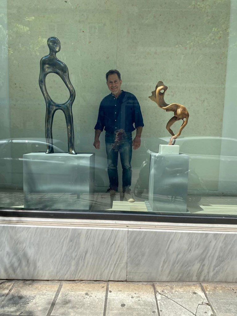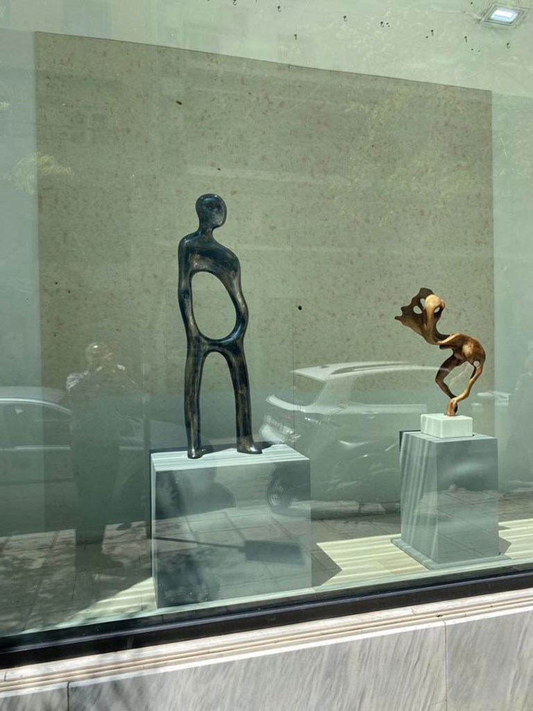 Στη διπλανή βιτρίνα, άλλα δύο έργα του καλλιτέχνη «συνομιλούν» μεταξύ τους. Το ένα είναι φτιαγμένο από μπρούτζο και το άλλο από ξύλο πλάτανου και πιθανόν να …λένε για την ευχέρεια του δημιουργού τους να χειρίζεται διαφορετικά υλικά.