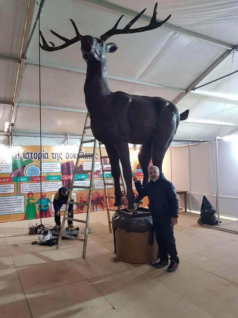 Εκατόν είκοσι κιλά σοκολάτας, τύπου κουβερτούρας, χρειάστηκαν για να παρασκευαστεί το μεγαλύτερο, όπως όλα δείχνουν, σοκολατένιο ελάφι του κόσμου. Το εντυπωσιακό σοκολατένιο γλυπτό, ύψους τεσσάρων μέτρων και δέκα εκατοστών, του δημιουργού πολύμορφων κατασκευών Βασίλη Μιχαηλίδη, διεκδικεί ένα βραβείο Γκίνες.
