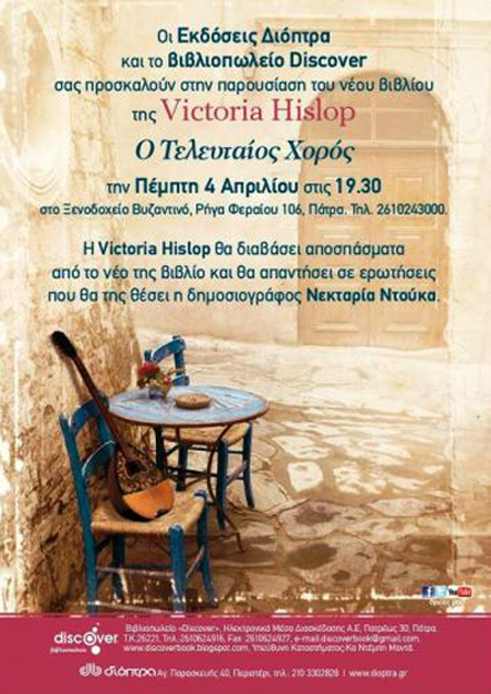 Η Victoria Hislop θα διαβάσει αποσπάσματα από το νέο της βιβλίο και θα απαντήσει σε ερωτήσεις που θα της θέσει η δημοσιογράφος Νεκταρία Ντούκα.
