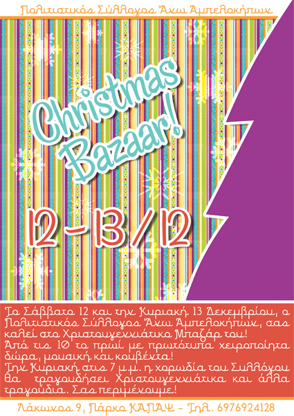 Το Σάββατο 12 και την Κυριακή 13 Δεκεμβρίου πραγματοποιείται το Χριστουγεννιάτικο Bazaar του Πολιτιστικού Συλλόγου Άνω Αμπελοκήπων.