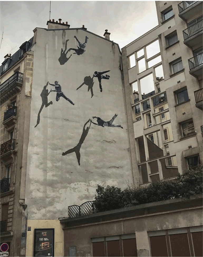 Ο νορβηγικής καταγωγής, εγκατεστημένος στο Βερολίνο, καλλιτέχνης δρόμου Άντερς Γκγένεσταντ (Anders Gjennestad) ζωγραφίζει μονότονες φιγούρες, συχνά ντυμένες με ριγέ μακό, που κινούνται με χάρη πάνω σε απρόσμενες επιφάνειες.