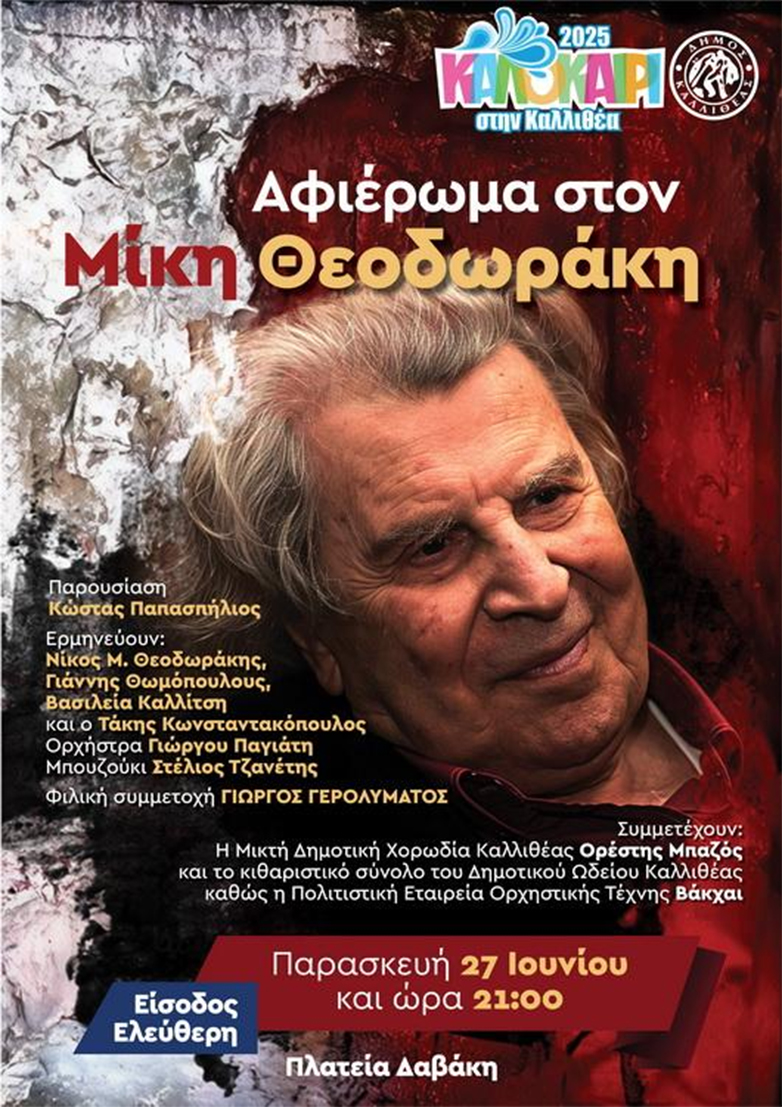 Συναυλία – αφιέρωμα στον Μίκη Θεοδωράκη διοργανώνει ο Δήμος Καλλιθέας, σήμερα Παρασκευή 27 Ιουνίου στις 9 το βράδυ στην Πλατεία Δαβάκη.