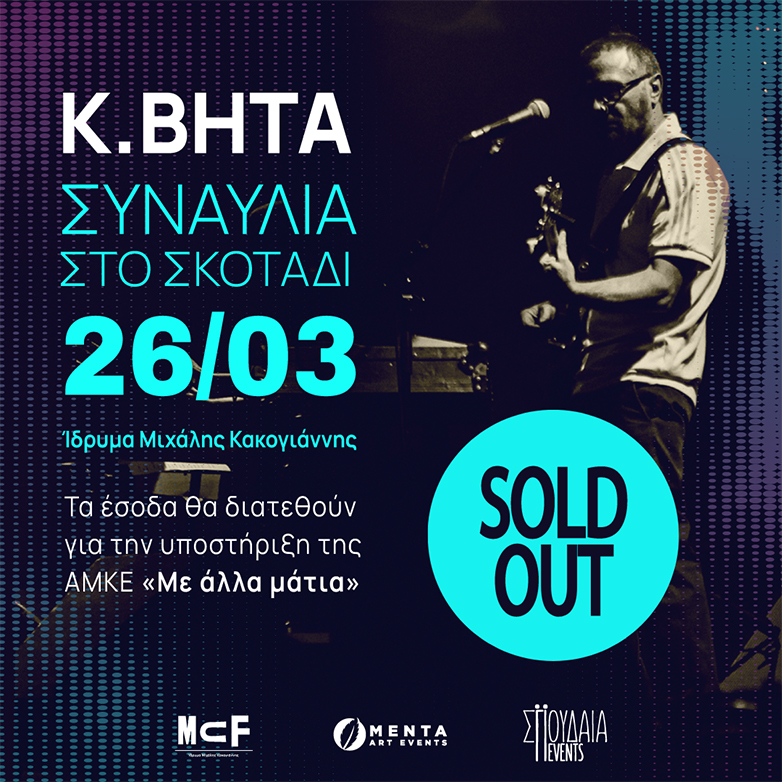 Ο Κωνσταντίνος Βήτα έρχεται την Τρίτη 26 Μαρτίου στο Ίδρυμα «Μιχάλης Κακογιάννης» για μία μυσταγωγική συναυλία στο σκοτάδι για την υποστήριξη της ΑΜΚΕ «Με άλλα μάτια». Μαζί του θα είναι ο Βάιος Μαχμουντές και ο Γιάννης Λαμπρόπουλος.