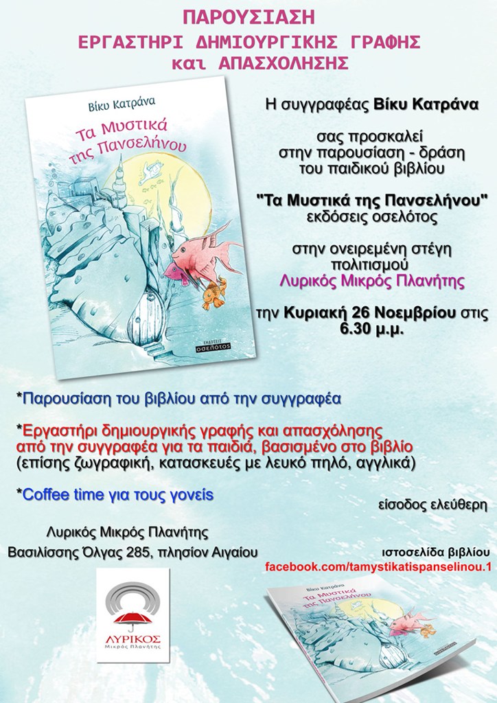 Στις 26 Νοεμβρίου, θα πραγματοποιηθεί παρουσίαση βιβλίου και εργαστηρίου δημιουργικής γραφής και απασχόλησης, από τη συγγραφέα Βίκυ Κατράνα.