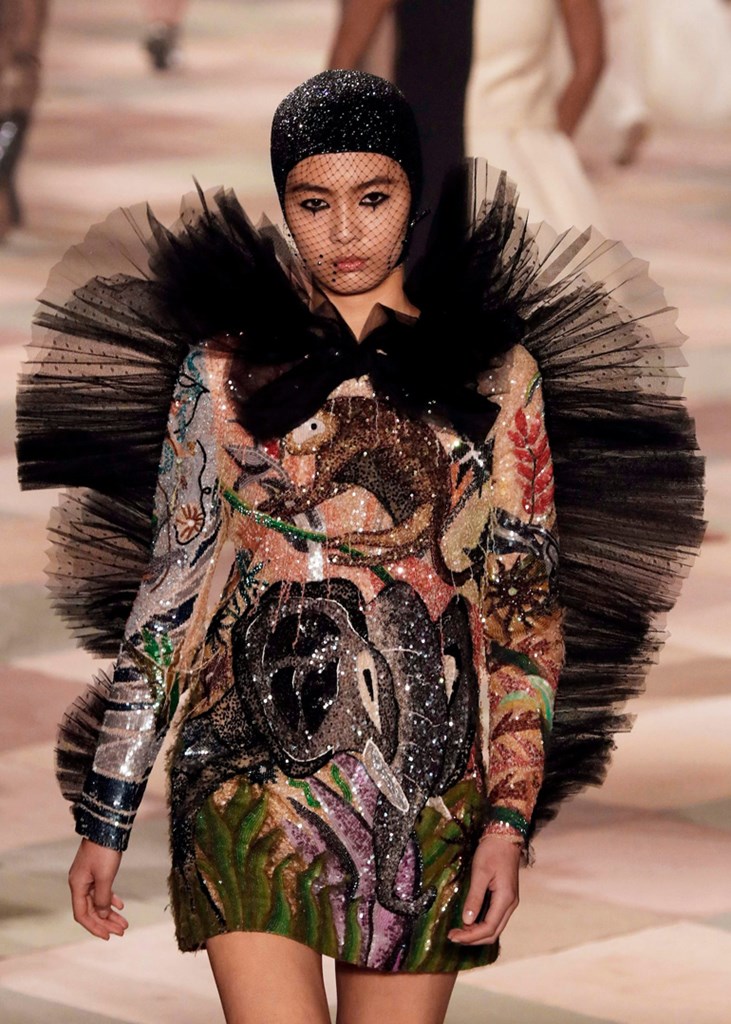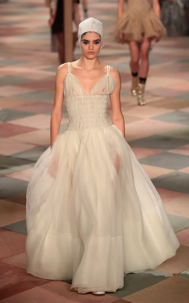 Στο εφετινό σόου στο Παρίσι για τη συλλογή Άνοιξη 2019 εντυπωσίασε ως νύφη η Βιτόρια Τσερέτι φορώντας ένα αστραφτερό ολόσωμο μαγιό από πούλιες και σκουφί κολύμβησης με πέπλο.