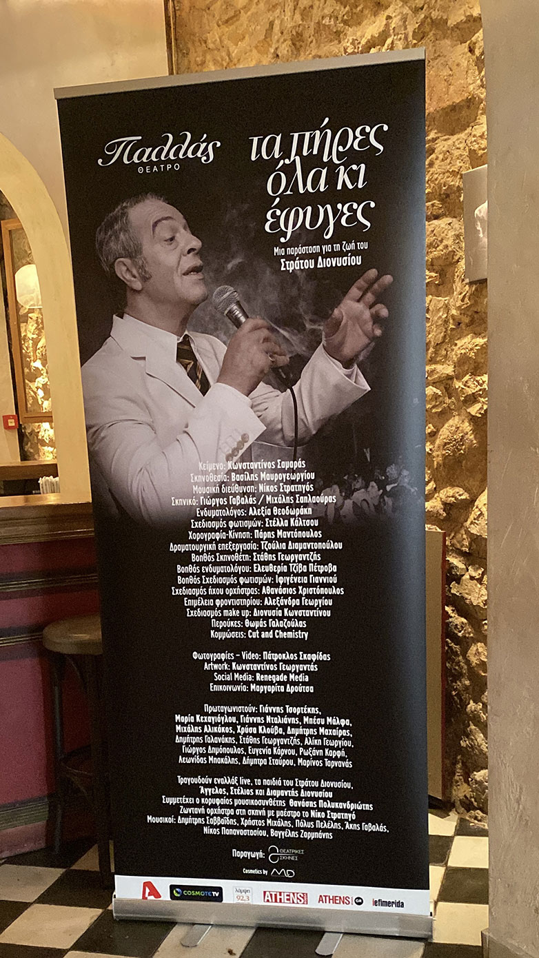 Μεσημέρι Τετάρτης στο κέντρο της Aθήνας και το «Περιβόλι του Ουρανού» μετονομάζεται σε «Στράτος», το όνομα του εμβληματικού νυχτερινού κέντρου του Στράτου Διονυσίου και υποδέχεται φίλους και συντελεστές με άρωμα λαϊκό, νοσταλγικό και με μια γεύση από τη νυχτερινή Αθήνα των 80’s στην παρουσίαση της μουσικοθεατρικής παράστασης – αφιέρωμα στον εμβληματικό βάρδο της Θεσσαλονίκης.