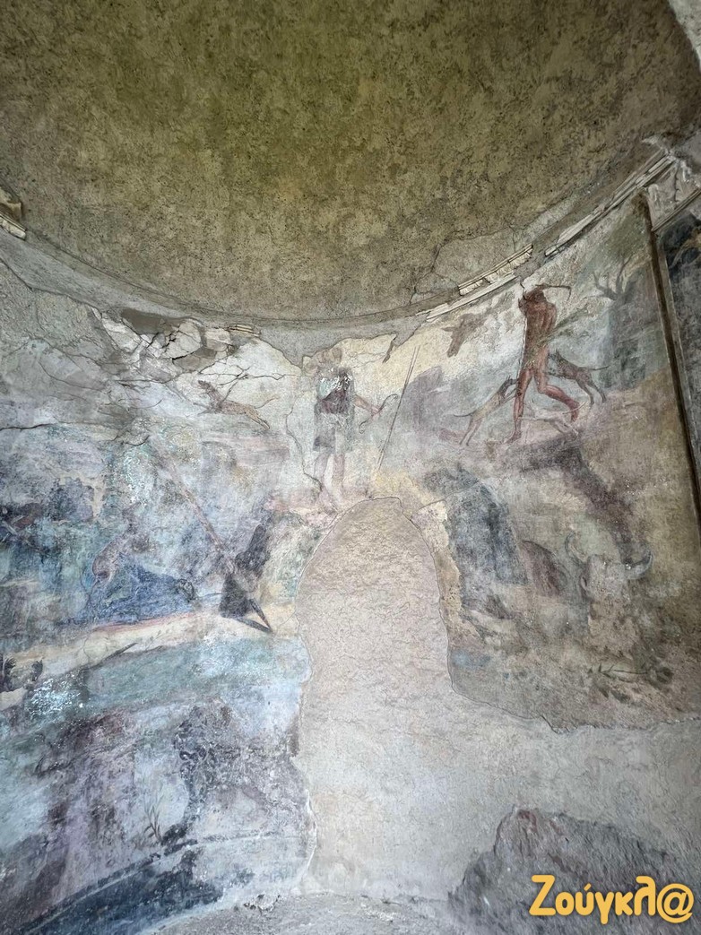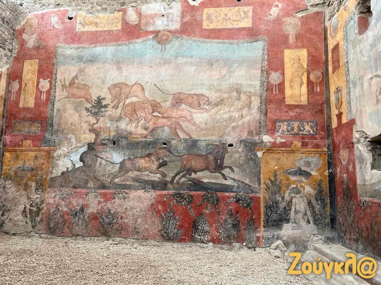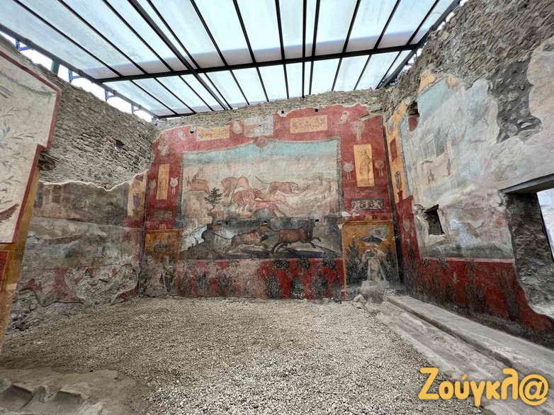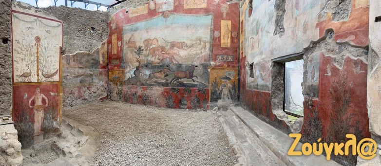 Εντυπωσιακή είναι και η τοιχογραφία που απεικονίζει μια σκήνη κυνηγιού με άγρια ζώα, μαζί με σκηνές από αιγυπτιακά τοπία, που κατοικούνται από Πυγμαίους και ζώα από το Δέλτα του Νείλου που αναπαρίστανται στους πλευρικούς τοίχους. Αυτά τα ζωγραφικά θέματα ήταν συχνά επαναλαμβανόμενα στη διακόσμηση των περιμετρικών τοίχων των κήπων των οικιών της Πομπηίας, προκειμένου να επεκτείνουν μέσω μιας ψευδαίσθησης, τις διαστάσεις αυτών των χώρων και να προκαλέσουν στο εσωτερικό τους μια ειδυλλιακή ατμόσφαιρα. Στην περίπτωση της οικίας των Ceii, κατά πάσα πιθανότητα το θέμα της αναπαράστασης μαρτυρεί ένα σύνδεσμο και ένα συγκεκριμένο ενδιαφέρον του ιδιοκτήτη της οικείας για τον αιγυπτιακό κόσμο και τη λατρεία της Ίσιδας, ιδιαίτερα διαδεδομένης στην Πομπηία τα τελευταία χρόνια της πόλης, πριν καταστραφεί από την έκρηξη του ηφαιστείου.