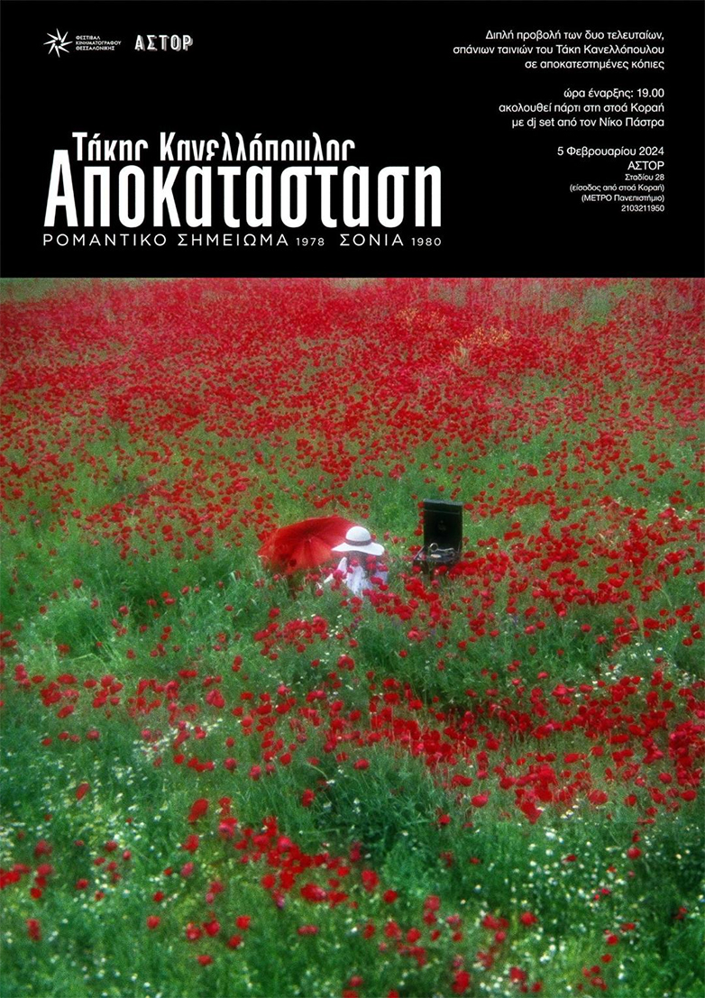 Το Φεστιβάλ Κινηματογράφου Θεσσαλονίκης παρουσιάζει τις δύο τελευταίες ταινίες του σπουδαίου σκηνοθέτη Τάκη Κανελλόπουλου στην Αθήνα, σε μια ξεχωριστή εκδήλωση με τίτλο «Τάκης Κανελλόπουλος: Αποκατάσταση». Τη Δευτέρα 5 Φεβρουαρίου θα προβληθούν στον κινηματογράφο Άστορ οι ταινίες Ρομαντικό σημείωμα (1978) και Σόνια (1980), οι πιο άγνωστες, παραγνωρισμένες και αδικημένες ταινίες του οραματιστή δημιουργού από τη Θεσσαλονίκη, τις οποίες αποκατέστησε ψηφιακά το Φεστιβάλ, με την υποστήριξη του Ελληνικού Κέντρου Κινηματογράφου.