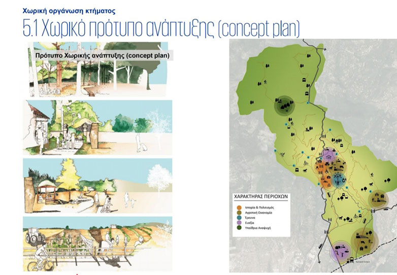 l Δυνατότητα ανάπτυξης αγροτικών δραστηριοτήτων στη ζώνη Δ2. Πρόκειται για τη ζώνη που βρίσκεται ο παλιός αμπελώνας, καθώς και οι ανακτορικοί κήποι, με σκοπό την αναβίωση των παραδοσιακών καλλιεργειών του κτήματος και την ανάδειξη των κήπων.