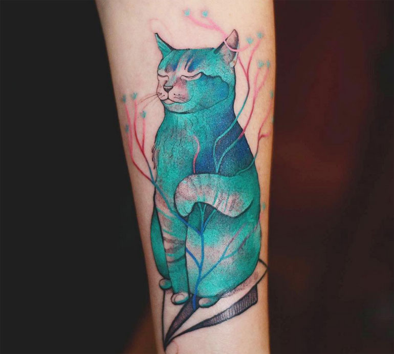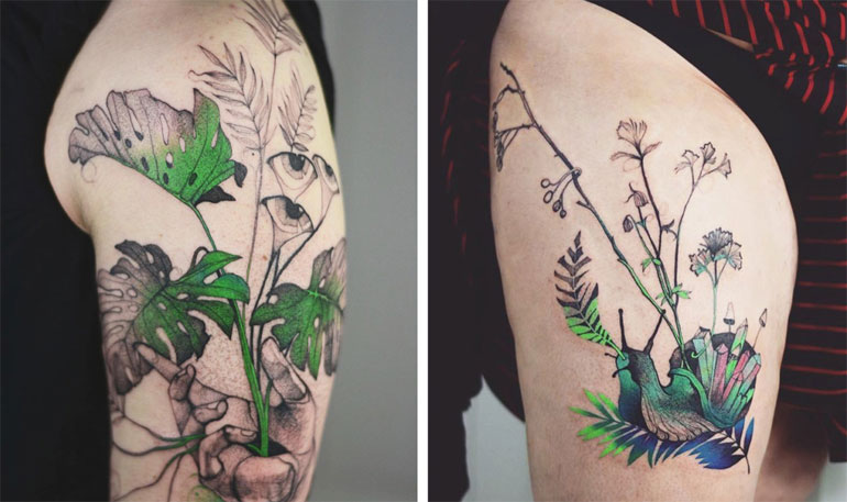 Τα τατουάζ της έχουν ως εφαλτήριο τη φύση – ένα σαλιγκάρι κυλάει αργά πάνω σε ένα φύλλο, ένα δέντρο ξεπετιέται από μία παλάμη – αλλά, συχνά, η ψυχεδελική ματιά της «επιστρώνει» ανθρώπινες μορφές με μοτίβα από το φυτικό ή ζωικό βασίλειο. Όπως στην περίπτωση του τατουάζ της «Φρίντα Κάλο», όπου η μάσκα σε έντονο κόκκινο χρώμα ενός πουλιού έρχεται να εναποτεθεί στο πρόσωπο της πασίγνωστης Μεξικανής ζωγράφου.