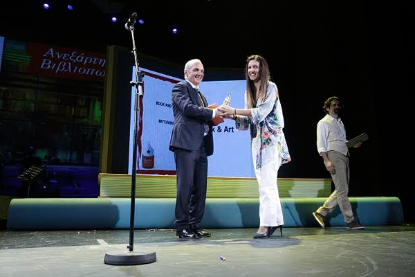 Η υπεύθυνη του βιβλιοπωλείου Book & Art νικήτρια του βραβείου για το Ανεξάρτητο Βιβλιοπωλείο και ο Γιάννης Τροχόπουλος, Επικεφαλής Διοργάνωσης της «Αθήνα, Παγκόσμια Πρωτεύουσα Βιβλίου 2018».