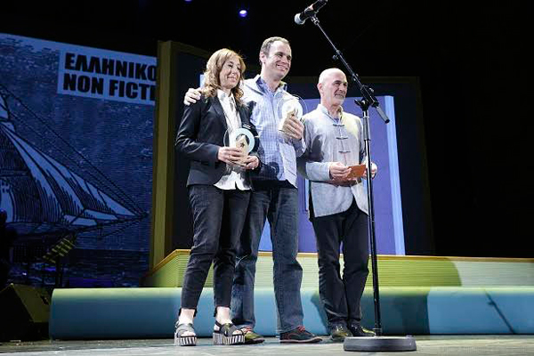 Οι Νίκος Αργύρης, Κατερίνα Αργύρη και Βασίλης Γρετσίστας των εκδόσεων Ίκαρος με τη νικήτρια της κατηγορίας Ελληνικό Μυθιστόρημα, Ευτυχία Γιαννάκη.