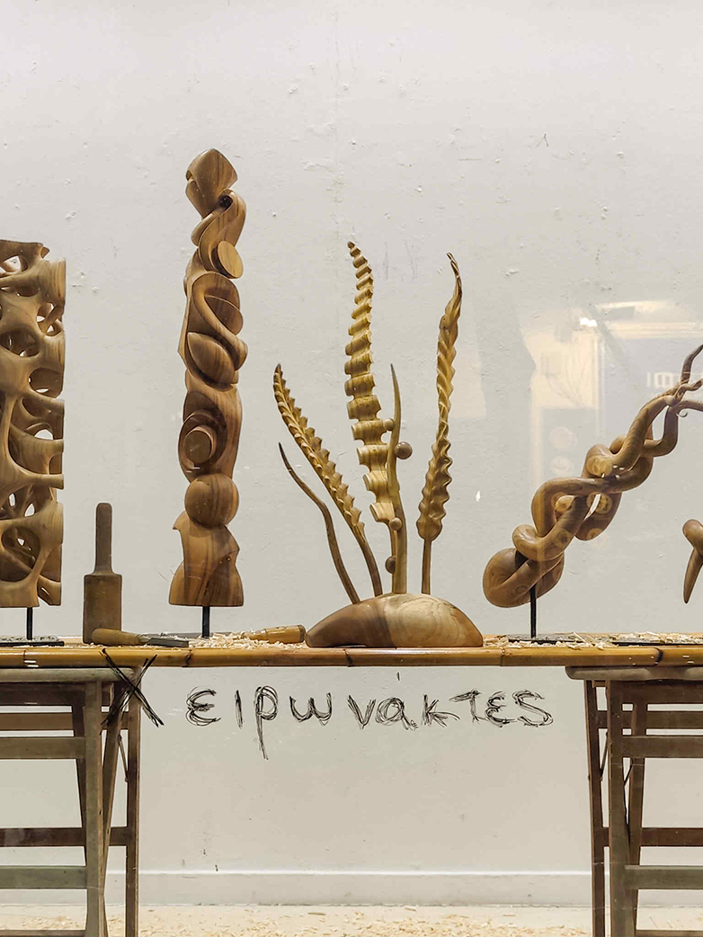 Τρεις δημιουργοί που εργάζονται με τα χέρια, μετατρέποντας το υλικό σε τέχνη, τη λειτουργικότητα σε ποίηση. Ξύλο που κόβεται, λαξεύεται, συντίθεται. Ιδέες που μεταμορφώνονται σε αντικείμενα και εγκαταστάσεις.
