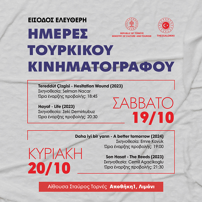 – Κυριακή 20 Οκτωβρίου στις 19:00 «Daha iyi bir yarın» (Α better tomorrow) 2024/ 108′ σε σκηνοθεσία Emre Kavuk. Τέλος, στις 21:30 «Son Hasat» (The Reeds) 2023/123′, σε σκηνοθεσία Cemil Agacikoglu.