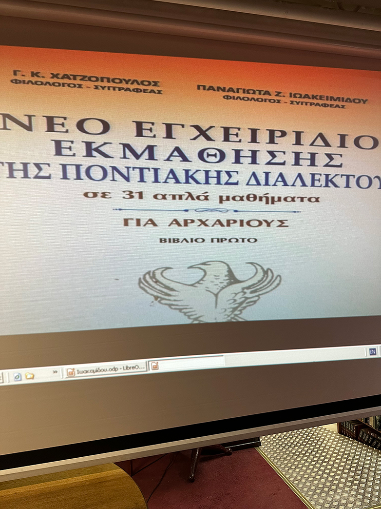 «Οι ρίζες μας είναι η ιστορία μας, η γλώσσα μας, τα ήθη, τα έθιμά μας, ο πολιτισμός μας. Χαίρομαι πολύ που υπάρχει μεγάλο ενδιαφέρον για την ποντιακή διάλεκτο από νέους φοιτητές στο Δημοκρίτειο Πανεπιστήμιο, που διδάσκω για δεύτερη χρονιά την ποντιακή διάλεκτο, λέει η κ. Γιώτα Ιωακειμίδου. Μιλώντας για το “Χρηστικό Λεξικό – Δάνειες Λέξεις στην Ποντιακή Διάλεκτο” , είπε : “Δεν πρέπει να μας ξενίζει το γεγονός ότι στη διάλεκτο του Πόντου εμφιλοχώρησαν ξένες λέξεις, όπως τουρκικές, σανσκριτικές, ρωσικές, ιταλικές, λατινικές, αρμενικές, περσικές, αραβικές, κουρδικές, γεωργιανές, βενετικές, σλαβικές και αγγλικές. Ήταν εύλογο να συμβεί κάτι τέτοιο, αφού ο Πόντος, λόγω της γεωγραφικής του θέσης και των πλουτοπαραγωγικών πηγών του, υπήρξε σταυροδρόμι λαών. Παρ’ όλα αυτά η Διάλεκτος του Πόντου διατήρησε τον δεσμό της με την αρχαία ελληνική γλώσσα, νόμιμη κόρη της οποίας αναμφίβολα είναι, όπως αποδεικνύεται περίτρανα τούτο από την παράθεση των σχετικών λέξεων».