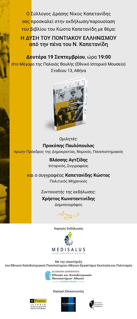 Πιο συγκεκριμένα η παρουσίασή του θα γίνει στις 19:00 στο Μέγαρο της Παλαιάς Βουλής (Εθνικό Ιστορικό Μουσείο) που βρίσκεται στην οδό Σταδίου 13 και κεντρικός ομιλητής της θα είναι ο πρώην Πρόεδρος της Δημοκρατίας κ. Προκόπης Παυλόπουλος.