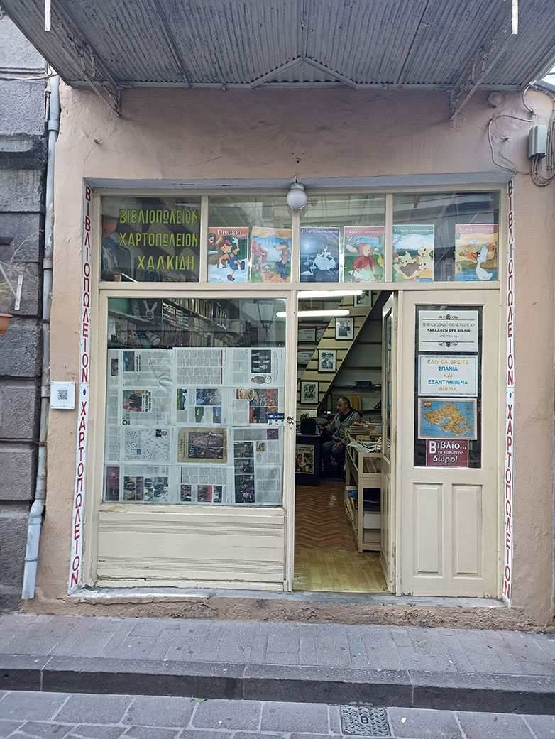 Σιγά σιγά σε ένα διπλανό καλάθι προστέθηκαν και μεταχειρισμένα βιβλία. Το αγόραζες, το διάβαζες και το επέστρεφες για να ξαναπουληθεί. Το 1955 τα… «καλάθια» μετακόμισαν στην οδό Αθανασίου Μητρέλια, στην καρδιά της γειτονιάς με τα λαδάδικα της πόλης, τα μαγαζιά όπου αποθηκεύονταν και μεταπωλούνταν τα λάδια του νησιού. Εκεί απάγκιασε η Λεσβιακή λογοτεχνία και όχι μόνο. «Στου Χαλκίδη» στο περιθώριο της λειτουργίας της χρηματιστηρίου του λαδιού συναντιόταν η Λεσβιακή διανόηση. Τολστόι και Ντοστογιέφσκι αγκαλιά με το Μυριβήλη και τον Βενέζη κι άλλους πολλούς. Ακόμα και οι περίεργοι της Μυτιλήνης είχαν τη θέση τους στο μαγαζί εν είδει συλλογής φωτογραφιών.