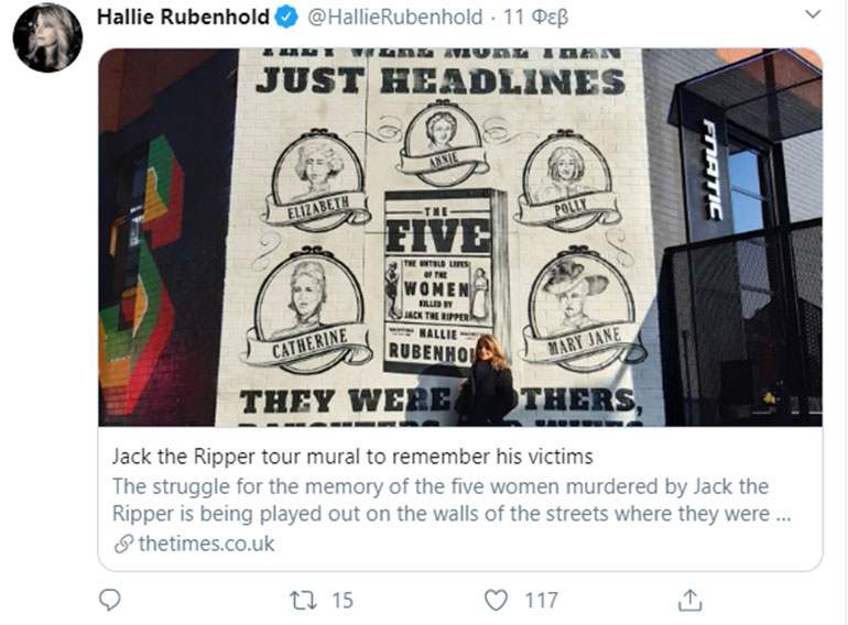 Με μια νέα τοιχογραφία στο Whitechapel του Λονδίνου, η ιστορικός Hallie Rubenhold σχεδιάζει να αποτίσει φόρο τιμής στις ζωές των γυναικών που δολοφόνησε ο Τζακ ο Αντεροβγάλτης, ελπίζοντας ότι αυτό θα γίνει αντίβαρο στις οργανωμένες «Jack the Ripper» ξεναγήσεις στην περιοχή. Το πρότζεκτ έχει ήδη τη μη δεσμευτική υποστήριξη των αρχών και τοπικών θεσμών, και η Rubenhold αισιοδοξεί: «Θα γίνει, είναι απλώς θέμα να βρεθεί το κατάλληλο μέρος».