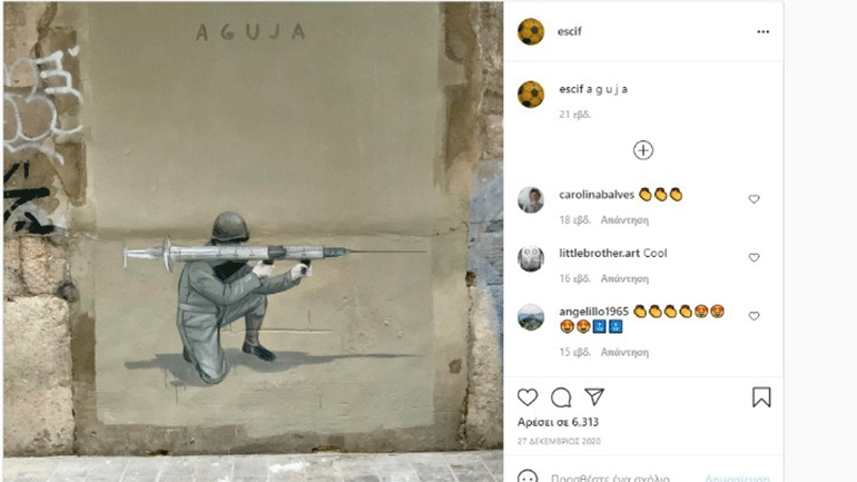 Τοιχογραφία για τον εμβολιασμό κατά του ιού δημιούργησε ο καλλιτέχνης δρόμου Escif, ο οποίος ολοκλήρωσε πριν λίγο καιρό σειρά δημόσιων εικαστικών παρεμβάσεων στην Κορσική και τους επόμενους μήνες αναχωρεί για Λιθουανία και βόρεια Ιταλία. Στην τοιχογραφία του, ένας στρατιώτης έχει γονατίσει και ετοιμάζεται να βάλει με μία σύριγγα, δίκην μπαζούκα.