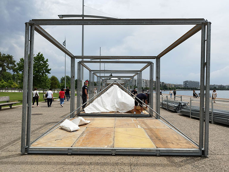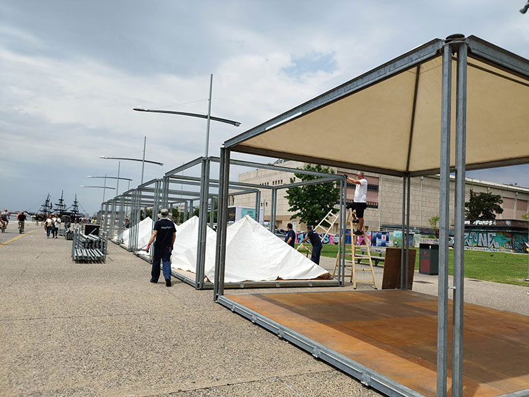 Την ώρα που στον ουρανό της Θεσσαλονίκης ο ήλιος με τα σύννεφα δίνουν μάχη για το ποιος θα επικρατήσει, οι σιδερένιες κατασκευές στη Νέα Παραλία αρχίζουν να στήνονται και σε κάποιες από αυτές τοποθετείται η λευκή τέντα στο πάνω μέρος, θυμίζοντας τα περίπτερα που φιλοξενούν κάθε χρόνο αγαπημένα βιβλία και νέες εκδόσεις στο πλαίσιο του Φεστιβάλ Βιβλίου της Θεσσαλονίκης.