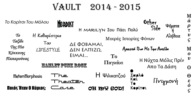 Ο Πολυχώρος Vault πιστός στο στόχο του να σχολιάσει και να προβάλει τη σύγχρονη κοινωνικοπολιτική πραγματικότητα καθώς και να προσφέρει σε νέους καλλιτέχνες ένα χώρο προβολής και ανάδειξης της δουλειάς τους, τη σεζόν 2014-15 δίνει έμφαση στο νεοελληνικό έργο, και παρουσιάζει μια σειρά από έργα νέων δημιουργών με σύγχρονη ματιά, δράμματα και κωμωδίες και παραστάσεις για παιδιά.