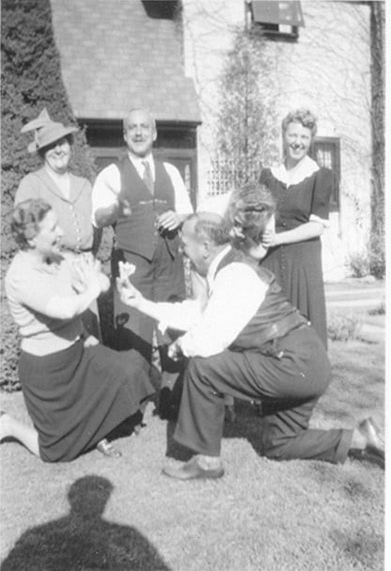 Πάνω Αριστερά η μικρή Όλγα Σταματίου και πίσω ο πατέρας της, Ευάγγελος. Δίπλα του η Μαρία Κόκκορη, κόρη του αδελφού του Γιώργου Παπανικολάου, Νάσου, η οποία αργότερα συνέγραψε και τη βιογραφία του. Αριστερά η Μάχη Παπανικολάου, στο σπίτι του ζέγους Παπανικολάου στο Douglaston, Long Island. Δεξιά: Ο Γιώργος Παπανικολάου δίπλα στη σύζυγό του, Μάχη και τον ανιψιό του, Ευάγελο, γιο της αδελφής του, Νίνας.