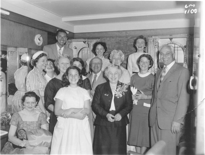 Η Όλγα Σταματίου, ανιψιά του Παπανικολάου, το κορίτσι με το λευκό φόρεμα και πίσω η μητέρα και η αδελφή της. Δίπλα στην αδελφή της, ο Γιώργος Παπανικολάου και μπροστά του η σύζυγός του, Μάχη, ενώ δεξιά ο πατέρας της Όλγας, Ευάγγελος. Βρίσκονται πάνω στο πλοίο Queen Mary το 1957, λίγο πριν το ζεύγος Παπανικολάου επιστρέψει για λίγο στην Ελλάδα, έπειτα από 44 ολόκληρα χρόνια.