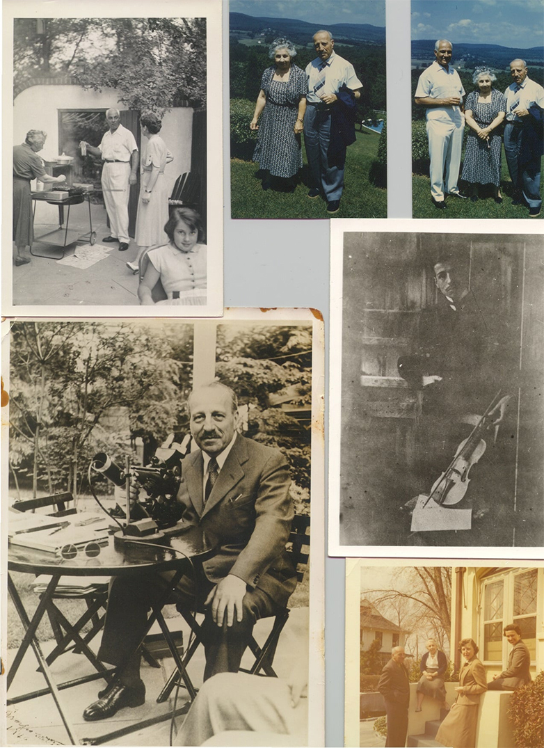 Φωτογραφία με βιολί – Ο Γιώργος Παπανικολάου αγαπούσε με πάθος τη μουσική. Στα γυμνασιακά του χρόνια ασχολήθηκε με το βιολί περίπου 8 χρόνια. Φωτογραφία με μικροσκόπιο – Ο Γιώργος Παπανικολάου με το περίφημο μικροσκόπιό του, στον κήπο του σπιτιού του στο Long Island. Κάτω δεξιά: Ο Γιώργος Παπανικολάου με τη σύζυγό του και μέλη της οικογενείας του.