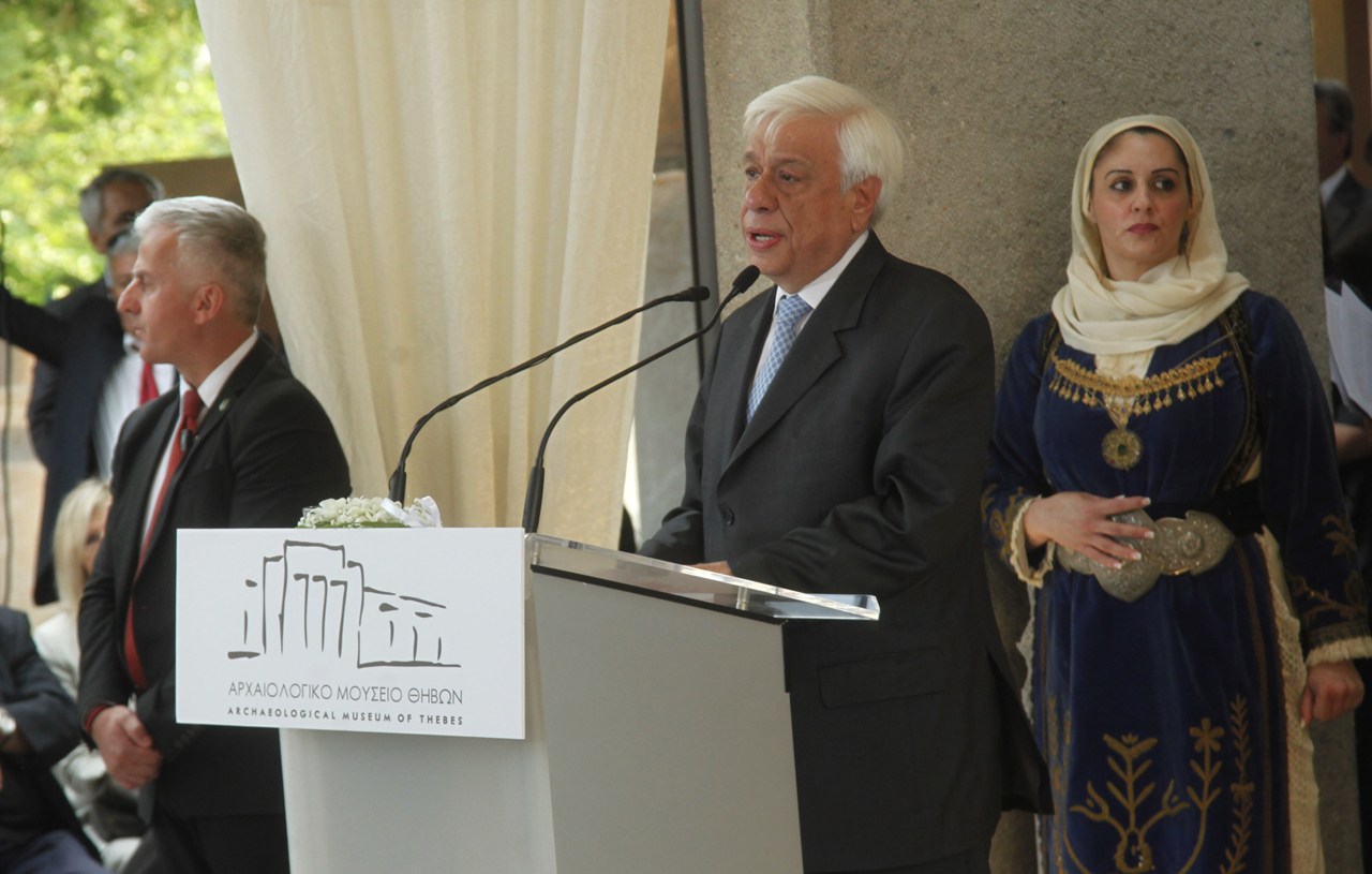 Ο Πρόεδρος της Δημοκρατίας έκανε ιδιαίτερη αναφορά στις αποκαλύψεις της αρχαιολογικής σκαπάνης χαρακτηρίζοντας την Βοιωτική γη ως «μία από τις κορυφαίες εστίες», όπως είπε, που «παρέχει ακαταμάχητα επιστημονικά τεκμήρια με αφετηρία την παλαιολιθική εποχή». Έκανε ιδιαίτερη αναφορά στις 18 ενότητες στις οποίες εντάσσονται τα εκθέματα του Μουσείου προσδιορίζοντας με σαφήνεια «την αρχαιολογική τους αξία και συγχρόνως την ανεκτίμητη για το έθνος των Ελλήνων πολιτισμική κληρονομιά». Επικέντρωσε τις αναφορές του στον «Θηβαϊκό κύκλο» που όπως χαρακτηριστικά είπε «είναι ο κύκλος των μύθων και των θρύλων οι οποίοι έχουν εμπνεύσει κορυφαίους τραγωδούς της κλασικής αρχαιότητας τα έργα των οποίων παραμένουν αθάνατα» και μάλιστα με νόημα σημείωσε πως «δεν πρέπει κανείς να βιασθεί να διαγράψει ή και να υποβαθμίσει την αξία του μύθου –του κάθε μύθου- αφού αυτός, ex definitione, εμπεριέχει αρχή ιστορικής αλήθειας». Ο Πρόεδρος της Δημοκρατίας αναφερόμενος στην αρχαία τραγωδία σημείωσε ότι «όχι μόνο δεν προδίδει αλλά αντιθέτως υπηρετεί την επιβίωση της ιστορικής αλήθειας».
