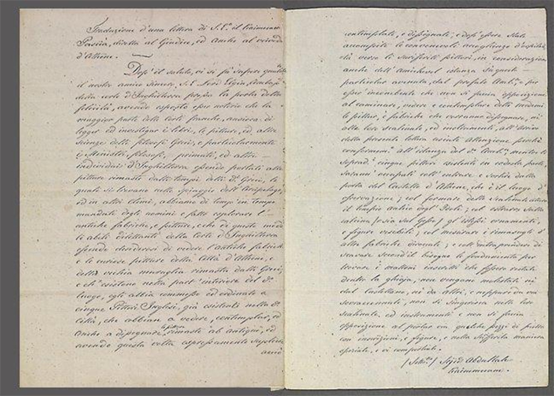 Σε ειδοποιούμε ότι ο ειλικρινής Φίλος ή Εξοχότητα του Λόρδος Έλγιν Έκτατος Πρεσβευτής από την Αγγλική Αυλή στην Πύλη της Ευτυχίας, μας έχει βεβαιώσει ότι είναι γνωστό πως οι περισσότερες Φράγκικες [χριστιανικές] Αυλές επιθυμούν να διαβάσουν και να μελετήσουν τα βιβλία, γλυπτά και άλλα επιστημονικά έργα των Αρχαίων Ελλήνων φιλοσόφων.