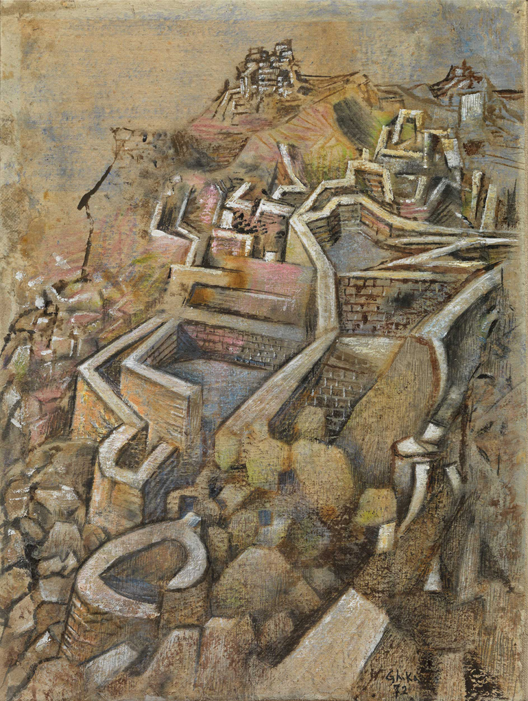 Σε ένα βαθύτερο επίπεδο, στο έργο του Νίκου Χατζηκυριάκου-Γκίκα (1906-1994) Υδρα τίθεται διλημματικά το ερώτημα: το λαβυρινθώδες αρχιτεκτονικό τοπίο εκφράζει τον ψυχολογικό τρόμο που δημιουργεί ο χώρος; Ή μήπως, το ζωντανό χρωματικό ιδεόγραμμα του ελληνικού φωτός αποτελεί μια έκφραση ελευθερίας από τους περιορισμούς που θέτει ο χώρος; Το ίδιο ερώτημα αναφύεται από τη ζωγραφική επιφάνεια πολλών έργων του καλλιτέχνη που είναι ένας από τους επιφανέστερους Ελληνες ζωγράφους του 20ου αιώνα. Τα ελληνοκεντρικά εικαστικά ιδεολογήματα της Γενιάς του ΄30 υπήρξαν η αφετηρία από την οποία εξελίχθηκε ο Γκίκας προς διαφορετικούς δικούς του προορισμούς. Από την Γενιά του Μεσοπολέμου που διαμόρφωνε την ελληνική εικαστική πορεία, το 1922 ο Γκίκας εγκαταστάθηκε στο Παρίσι. Εκεί γνώρισε και επηρεάστηκε από τον ευρωπαικό κοντερνισμό και κυρίως τον συνθετικό κυβισμό και την ανάγκη των εκφραστών του κινήματος να επαναφέρουν την αναπαράσταση της πραγματικότητας καταργώντας τη σχέση ανάμεσα σε μορφή και χώρο. Το 1937 ο Γκίκας ανακαίνισε το σπίτι της οικογένειας στην Υδρα όπου δημιούργησε συνδυάζοντας κυβιστικά και αρχιτεκτονικά στοιχεία με το φως και το χρώμα του ελληνικού χώρου.