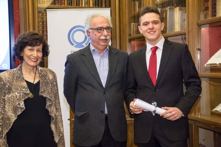 Η Γραμματέας Δ.Σ. του Ιδρύματος Ωνάση κα Μαριάννα Μόσχου και ο Υπουργός Παιδείας κ. Κώστας Γαβρόγλου συγχαίρουν τον Ραφαήλ Τσιάμη.