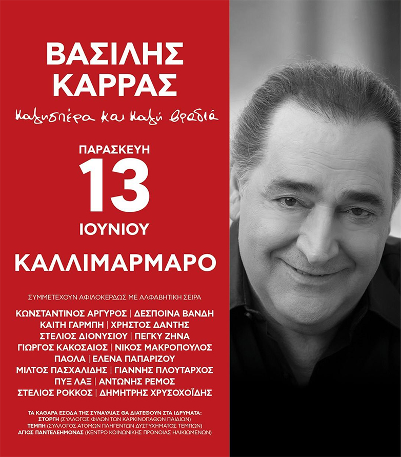 Στις 13 Ιουνίου λοιπόν, το Καλλιμάρμαρο αναμένεται να γεμίσει από πλήθος κόσμου που θα βοηθήσει το όνειρο του Βασίλη Καρρά να φτάσει ακόμα πιο ψηλά, σε μια βραδιά που δεν θα αποτελέσει ένα απλό «Αντίο» αλλά ένα μεγάλο «Ευχαριστώ» για όσα εκείνος πρέσβευε και άφησε ως παρακαταθήκη με το πέρασμά του.
