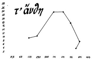 ῎Εκοψα ξανὰ τὶς λέξεις τῆς μαγνητοταινίας τότε, καὶ τὶς ξανακόλλησα μ᾿ ἄλλη σειρά. Πρῶτα ἔβαλα τὴν λέξη ποὺ παρουσίασε τὸ χαμηλότερο διάγραμμα: τὸ «ἀπ᾽». Μετά, τὴν λίγο δυνατότερη· τὴν λέξη «ἐλαφρές». Τρίτη ἔβαλα, βάσει τοῦ διαγράμματός της, τὴν λέξη «τοῦ Μαγιοῦ». Τέταρτη τὴν ἀμέσως εὐρυτέρου διαγράμματος λέξη «πνέουν». Πέμπτο, τὸ διάγραμμα «αὖρες» καὶ τέλος τὰ «ἄνθη». ῎Εφτιαξα δηλαδὴ μιὰ σειρὰ στὴν ταινία, ἀρχίζοντας ἀπ᾿ τὴν λέξη μὲ τὸ χαμηλότερο διάγραμμα καὶ προχωρώντας πάντα στὸ ἀμέσως ὑψηλότερο. Ὁπότε εἶδα μὲ τὰ μάτια μου τὴν ἑξῆς παρέλαση: βαρεῖα, περισπωμένη, ὀξεῖα, ψιλὴ περισπωμένη, ψιλὴ ὀξεῖα. ῞Οταν τ᾿ ἀκούει κανεὶς μαζεμένα, ἔχει τὴν ἐντύπωση μιᾶς φωνῆς ποὺ ξεκινᾶ ἀπὸ χαμηλὰ καὶ μὲ συνεχῆ ἀνεβοκατεβάσματα μᾶς ὁδηγεῖ σ᾿ ἕνα κρεσέντο. Ἀκοῦστε το. Θὰ προσπαθήσω νὰ σᾶς δείχνω ταυτόχρονα καὶ τὰ διαγράμματα: