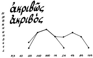 Ἀσήμαντη διαφορά. Συνδέσαμε τότε τὸν παλμογράφο. Νά τὸ διάγραμα τοῦ ἐπιθέτου ἀκριβός, ὅπως προέκυψε, καὶ νά τὸ πολὺ πλουσιότερο τοῦ ἐπιρρήματος.