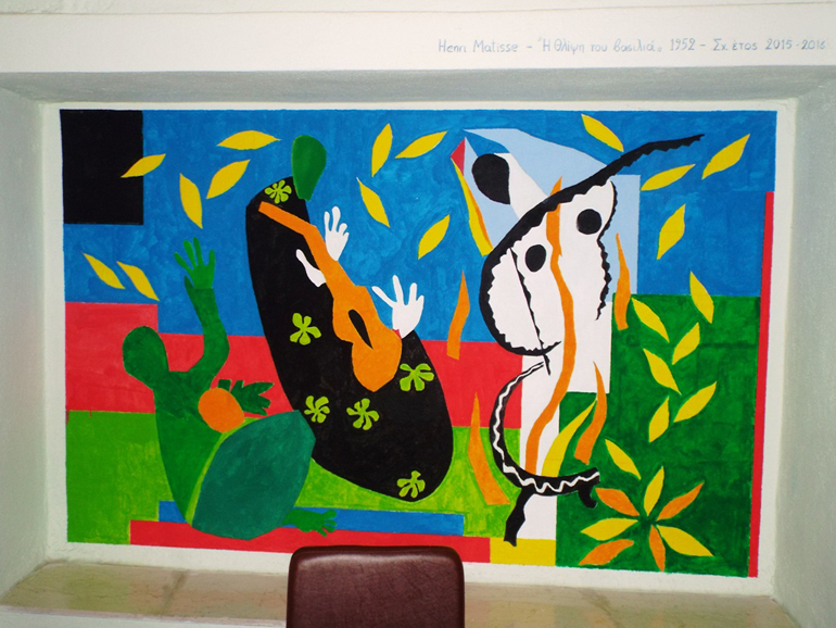 Όπου κι αν σταθείς, ο τοίχος περιβάλλεται από εικόνες και οπτικές επαφές με έναν κόσμο καλλιτεχνικό, όμορφο, που ζητά από τον θεατή να στρέψει το βλέμμα. Και μετά, να μάθει για τον Μιρό, τον Ακριθάκη, τον Πικάσο, τον Βαν Γκονγκ, τον Ματίς, τον Μόραλη… και άλλους ογκόλιθους της παγκόσμιας Τέχνης. Όπως τονίζει ο κ. Στάμος, «Το σκεπτικό ήταν να αντιγράψουμε έργα σημαντικών καλλιτεχνών, ώστε με το μέγεθός τους και τη χρωματική τους γκάμα, να αλλάξουν την ψυχρή ατμόσφαιρα των αιθουσών. Έτσι έγινε η παραμονή των μαθητών και των συναδέλφων πιο ευχάριστη και παράλληλα διδακτική για τη σύγχρονη τέχνη».